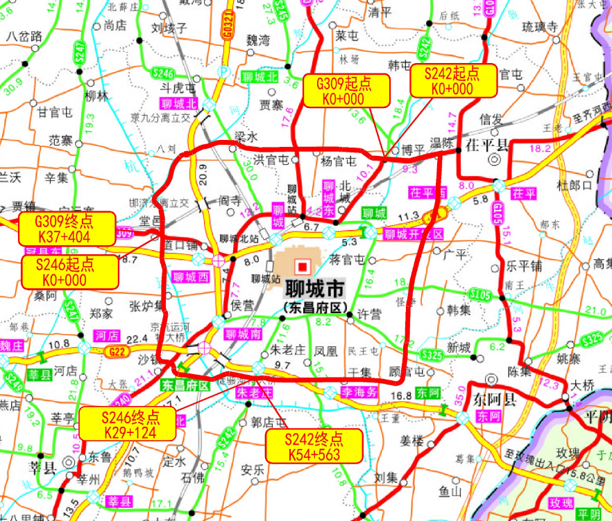 G309青兰线聊城绕城段,项目采用四车道一级公路技术标准建设,设计速度80公里/小时,路基宽度25.5米。起点位于茌平县博平镇东北G309青兰线与S242临商线交叉处,沿现有地方道路向西,在窦堂村西折向西北,在郭庄村南接既有博梁路向西,经大桑村南、穿杨官屯村,在小寨村北与G240保台线平面交叉,向西在回民李村西跨南水北调干渠,在王屯村东南跨越京杭大运河故道,继续向西在梁水镇北与S246临邹线平面交叉,在房屯村西下穿京九铁路,后沿马颊河河堤布线,在邱庄村东下穿既有德上高速,继续沿马颊河河堤向西南方向布线,在王铺村南跨位山三干渠,路线转向南利用现有位山三干渠西河堤布设,在三里庄村东南下穿邯济铁路后,终于东昌府区堂邑镇东与既有G309青兰线平面交叉处。本项目全长37.397公里,建设里程37.397公里。计划总投资145731万元,建设总工期24个月。